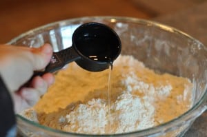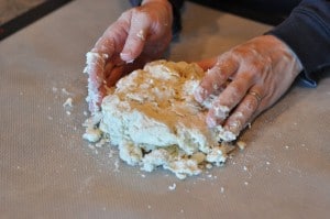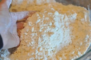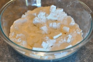 Using your handy-dandy pastry blender (or two knives) start working the butter into the flour…
