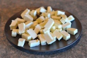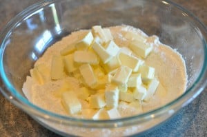 I start the process by cutting the butter into small pieces, putting it on a plate and setting it in the freezer for 10-15 minutes while I get the dry ingredients going.