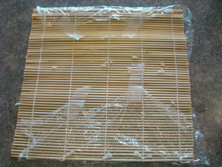Instead of the plastic wrap, I put my bamboo mat in a gallon size plastic ziplock bag. Worked like a charm with no tape needed!