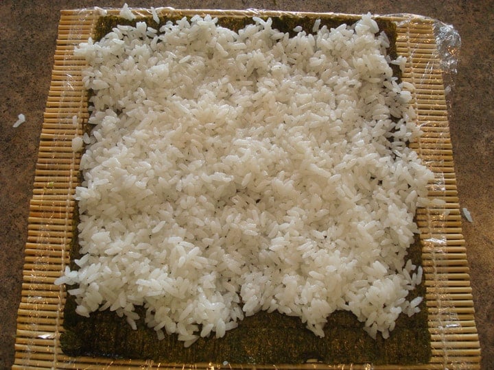 Using dampish-wet hands, spread the sticky rice to the edges of the mat, leaving a slight margin on the side closest to you, to help with sealing.