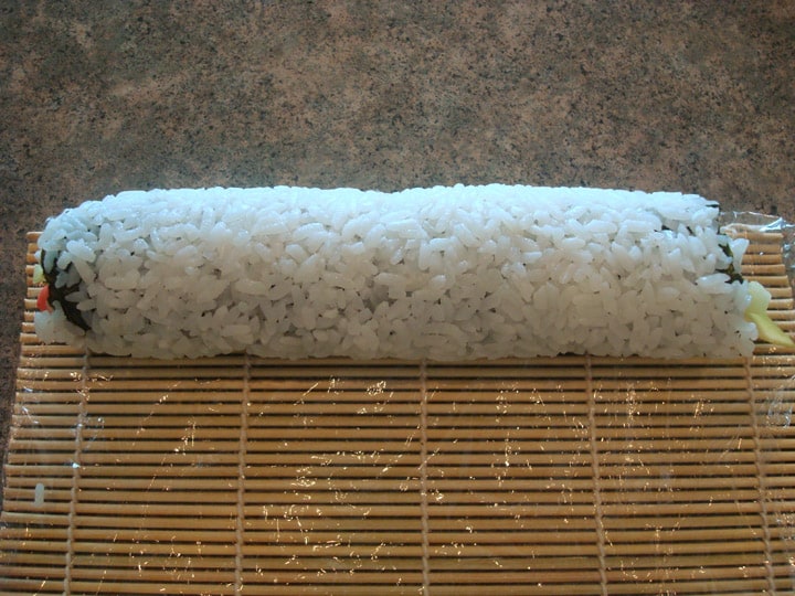 As you do this, the bamboo mat will have some overhang in front of your fingers, but that’s the sign that your California Roll is rolling up nice and tight.