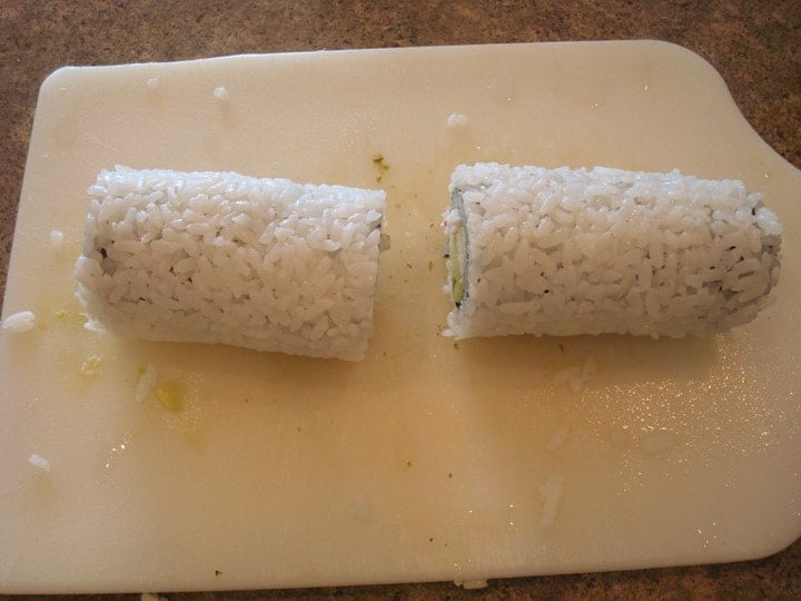 Then eighths – you get the picture. And have I mentioned…try not to stuff your face full of the California Rolls – I still need to show you how to roll it up with the nori on the outside.
