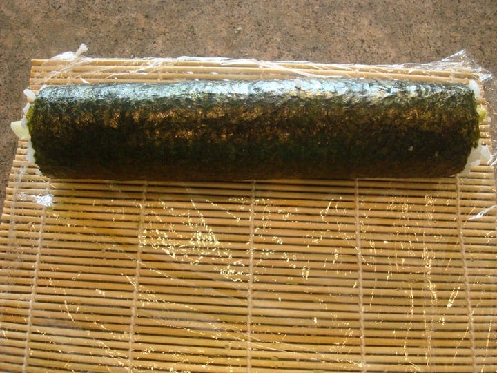 Continue this process of rolling, lifting up the bamboo mat and repositioning and rolling again, until you have reached the end of the mat and the sushi is tightly and completely rolled. At this point, wrap the bamboo mat around the roll and give it a final hug with your fingers so it is firm and evenly rolled (not too hard, though, or you’ll crush it to death). Now give a big shout of hallelujah and try not to stuff the entire roll in your face. The roll can be rolled in plastic wrap and refrigerated until ready to serve.