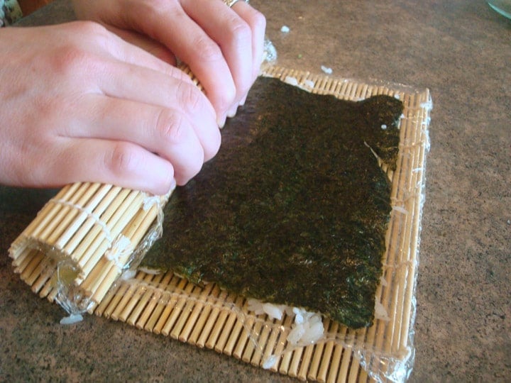 Now flip your bamboo mat back over and take a piece of that deliciously dark nori and place it on the top of the bamboo mat.