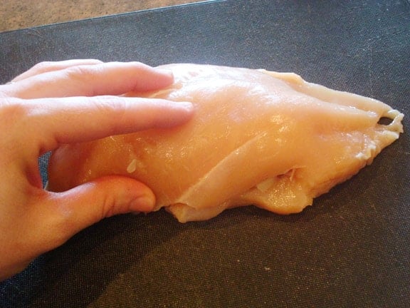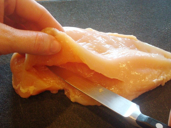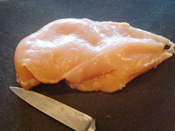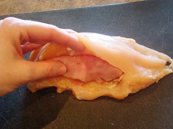 To stuff the cordon bleu, start with your thick chicken breast and have a sharp knife handy.