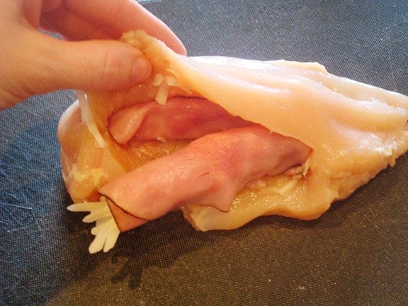 I don’t flatten it – I stuff the ham and cheese into the little pocket of the chicken breast.