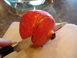 Cut the pomegranate in half vertically. With the cut side up, make 4 equally spaced cuts 1 inch long and 1 inch deep. Hold the pomegranate half, cut side down, over a deep bowl and pull the fruit open but not apart, using equal pressure from both hands. Holding the pomegranate half, cut side down, in the palm of one hand, whack the top of the fruit with the back of a large spoon. The seeds will fall out.